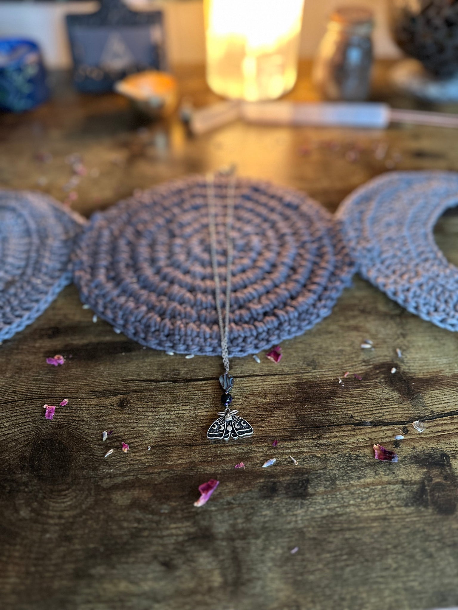 A sacred talisman for the intuitive, the night-watcher, and any soul who feels most alive under the moon. This necklace features a silver lunar moth - a symbol of transformation and rebirth, and messages from the other world.